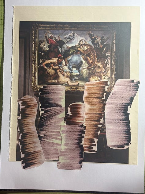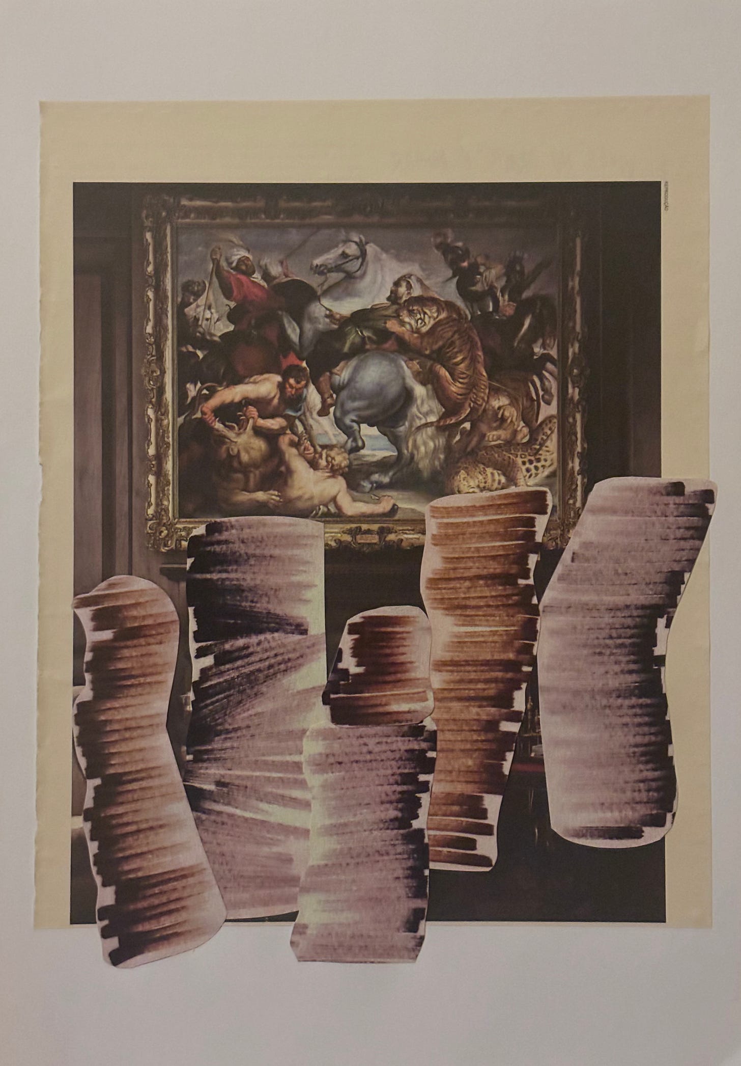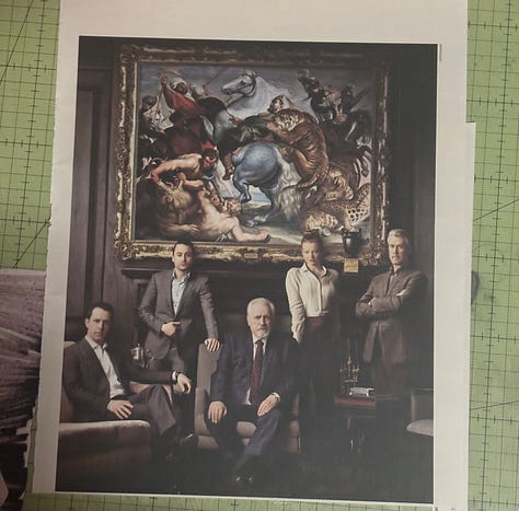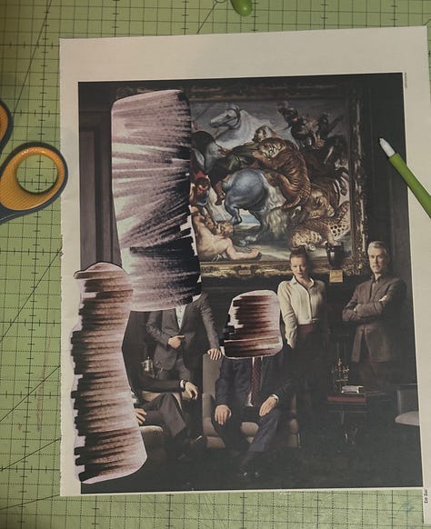 Vocês já assistiram Succession? Pois eu já, e achei a série incrível. O fundo da minha colagem, é uma foto da família Roy, pai e filhos, na biblioteca. Vejam aí os mundos se encontrando. A imagem original é uma pintura abstrata com pinceladas de duas cores. Uma puxando para o cinza, prata e preto, outra para marrom, dourado e preto. Fui recortando e pensando toda história tem pelo menos dois lados.