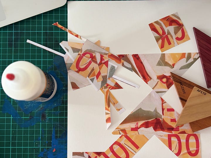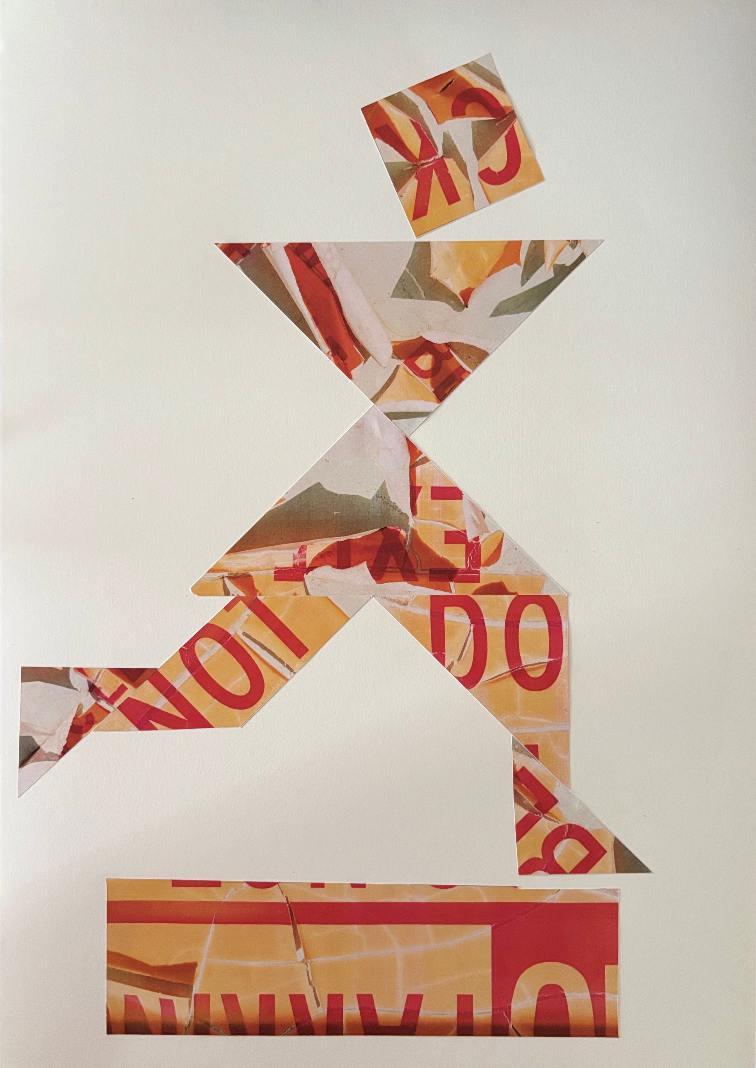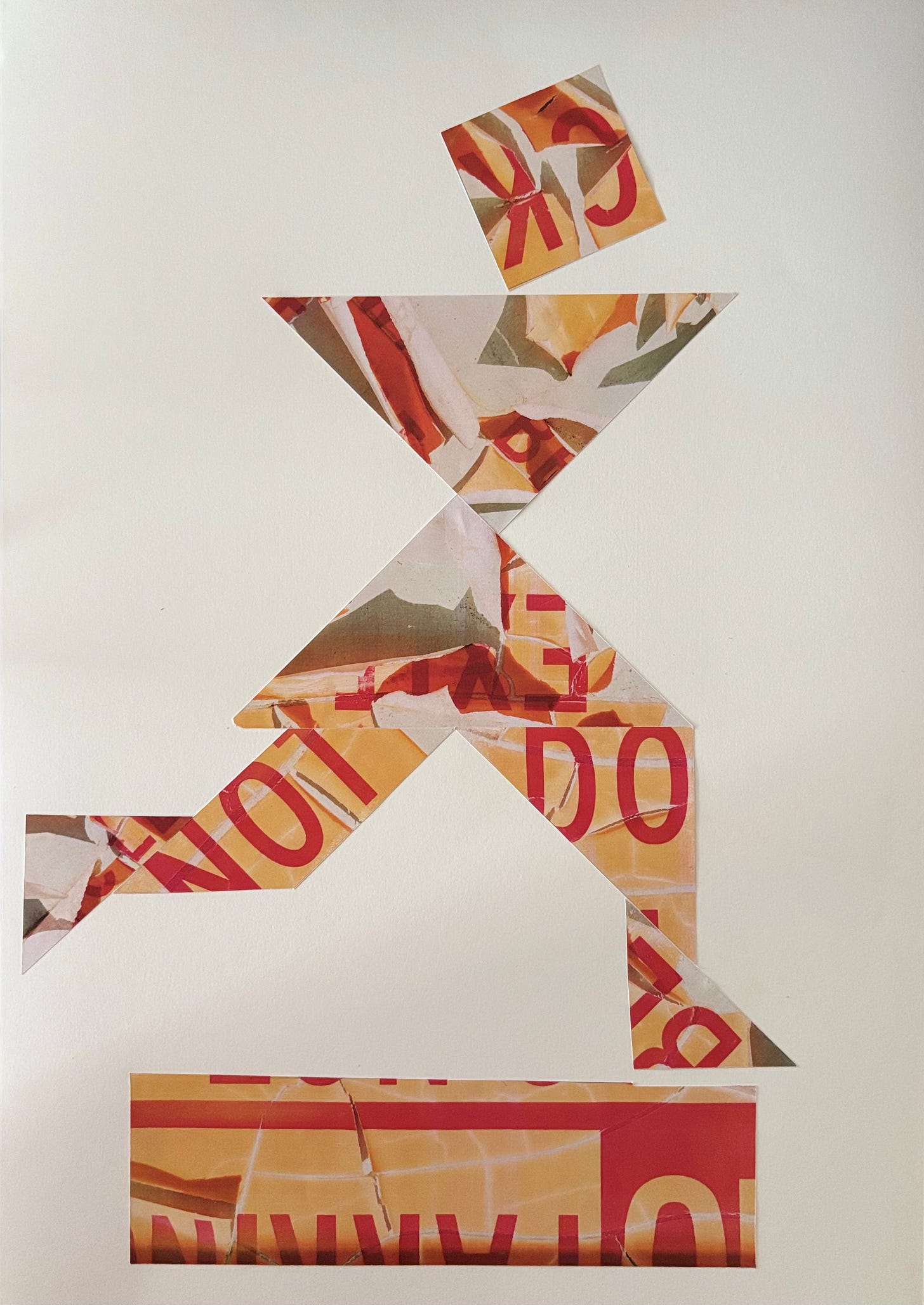 Para essa colagem, tive a ideia de fazer uma das figuras do Tangram. Nunca imaginei que esse jogo fosse me trazer tantas inspirações. Sete formas geométricas que podem virar pessoas, animais, plantas e objetos variados. Escolhi a imagem da corredora.